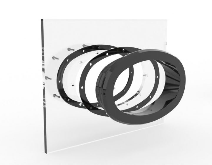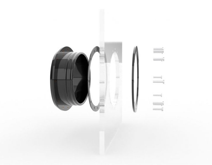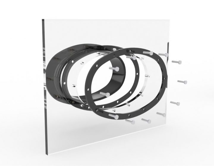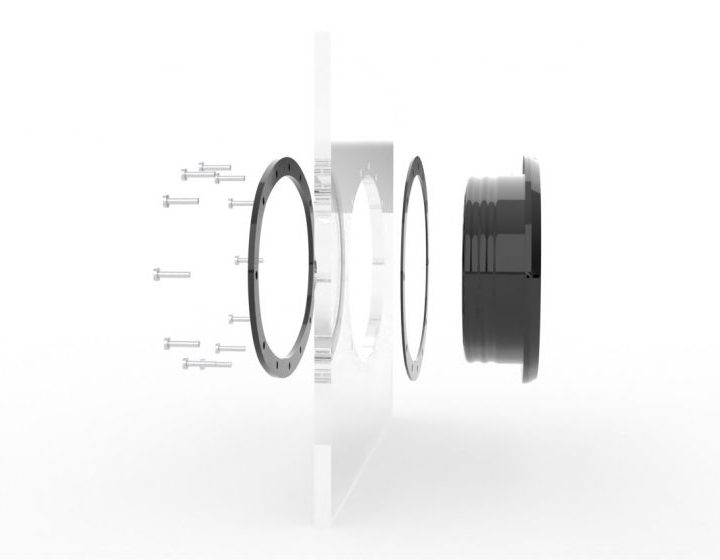 The unique design of the port allows it to be pushed through from the inside of the screen giving a smooth joinless internal finish. Pan head threaded screws hold the port in place with an acrylic pressure ring and gasket.